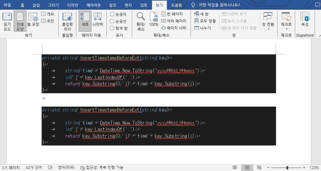 즉 이렇게 코드를 Word에 두 번 붙여넣었을 때, 위의 블럭은 제대로 검은 바탕에 표시되었지만 아래쪽 블럭은 그렇지 않은 것이다. Word에서 모든 서식 기호를 표시해봤지만 두 블럭 사이에 무슨 차이가 있는지는 아직 모르겠다...
